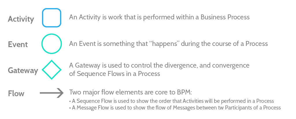 The Process Manager uses bpmn notation format. The main elements are represented using these shapes: