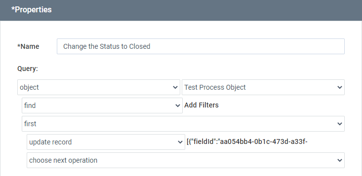 In most cases you will be making changes to the process object (the one that triggered the process). Add a name to describe the task then build the query as follows: