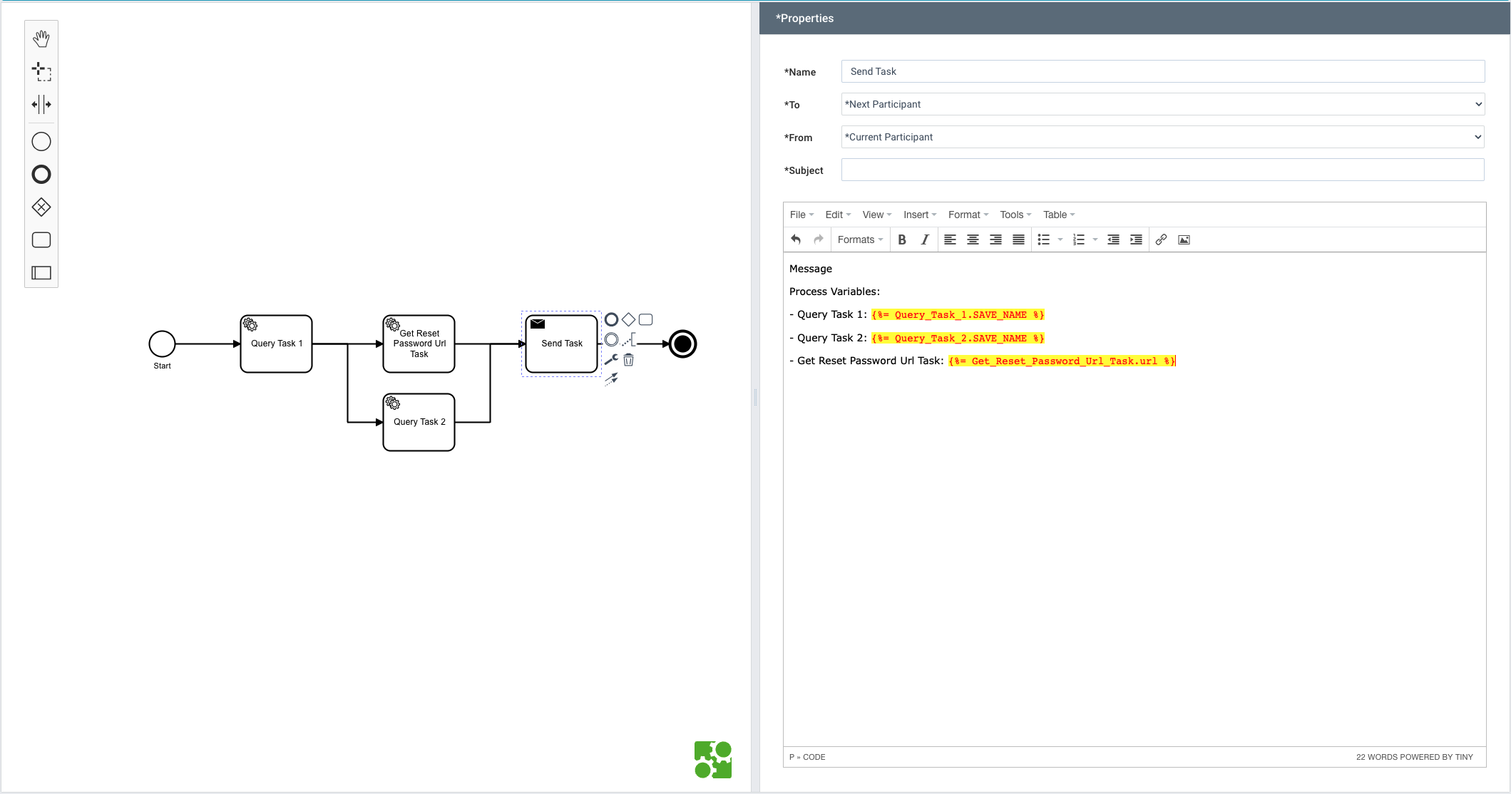 To work on message field using process variables (Query Task Save and Get Reset Password Url).
